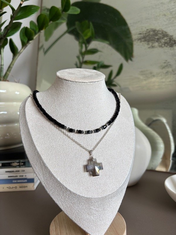 Collar cristales de roca negros cuadrados 4mm + piedras naturales ágata.