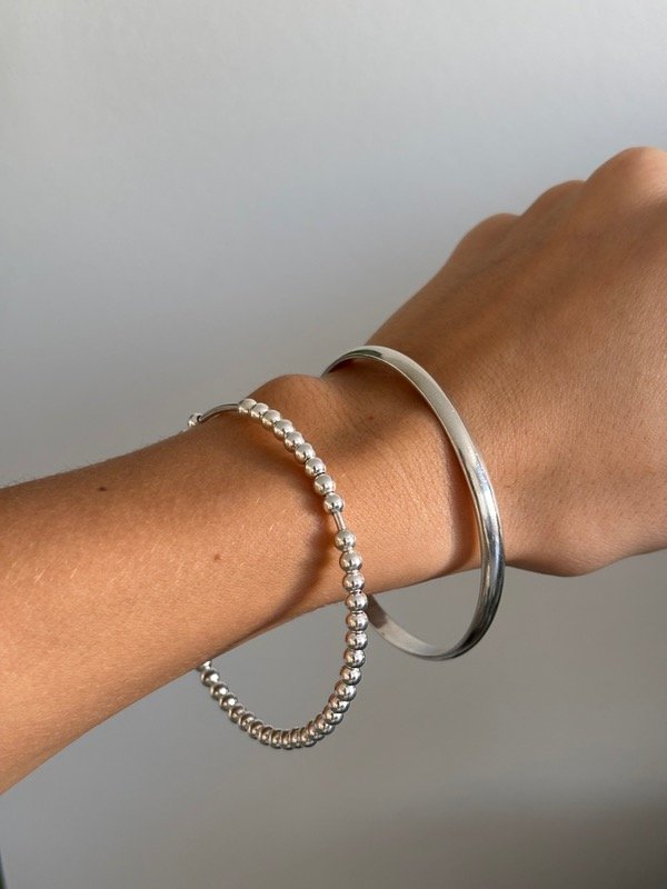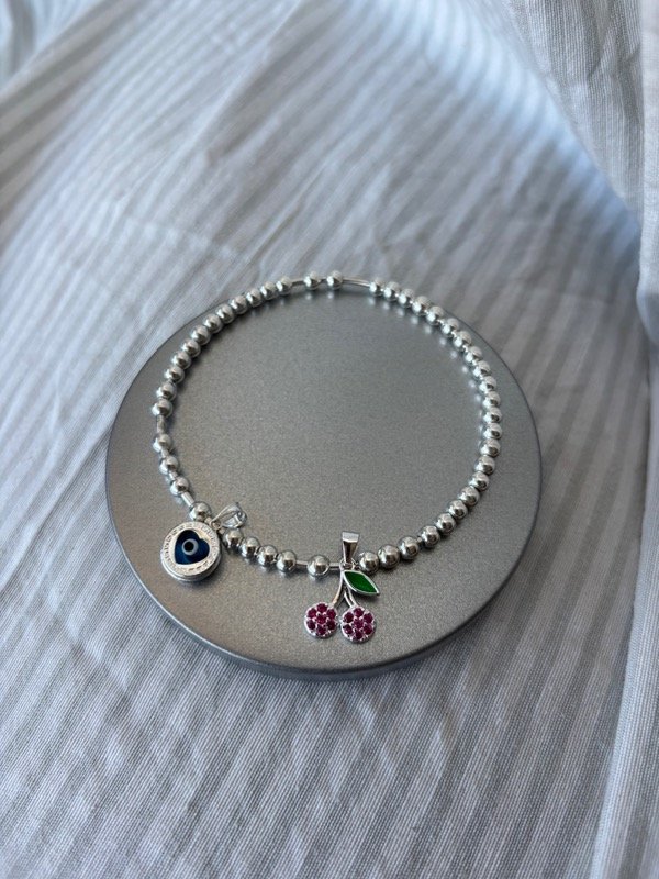 - pulsera aniversario con bolitas de 4mm con hilo de plata de 2mm . Diámetro de la pulsera 6,5. NO INCLUYE DIJES, se pueden agregar a gusto.